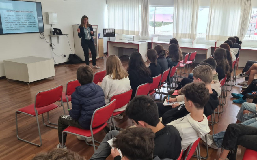 A associada Dalva Marin Medeiros, promotora de Justiça de Antonina e coordenadora regional do Grupo de Atuação Especializada em Meio Ambiente, Habitação e Urbanismo (GAEMA), no litoral, realizou recentemente uma palestra para alunos do 9º ano (faixa etária de 14 anos) do Colégio Suíço-Brasileiro, em Pinhais-PR, sobre Ministério Público (MP), Júri, Homicídio e Feminicídio.