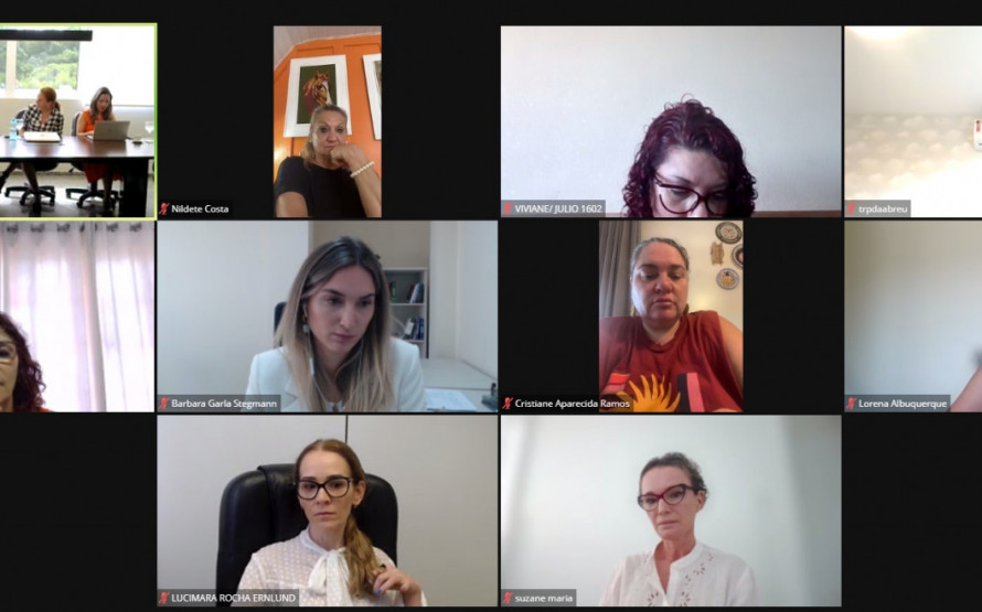 De forma remota participaram as promotoras de Justiça integrantes da comissão de apoio: Lucimara Rocha Erlund; Barbara Garla Stegmann; e a associada dependente, Nildete Dubinski Costa, bem como as representantes regionais da Diretoria de Mulheres: Suzane Maria Carvalho do Prado; Lorena Almeida Barcelos de Albuquerque; Cristiane Aparecida Ramos; Tânia Regina Pinho de Araújo Abreu; Viviane Moraes Ribeiro Gerelus e Elhanei Librelotto.