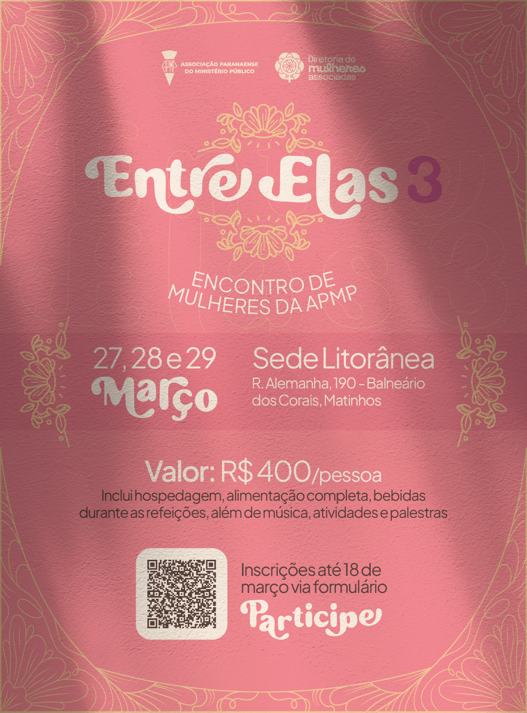 Estão abertas as inscrições para o “Entre Elas – 3º Encontro de Mulheres da APMP”, que acontece de 27 a 29 de março de 2026, na sede litorânea, em Matinhos. O evento integra as ações alusivas ao mês da mulher e é destinado às associadas, esposas e filhas.